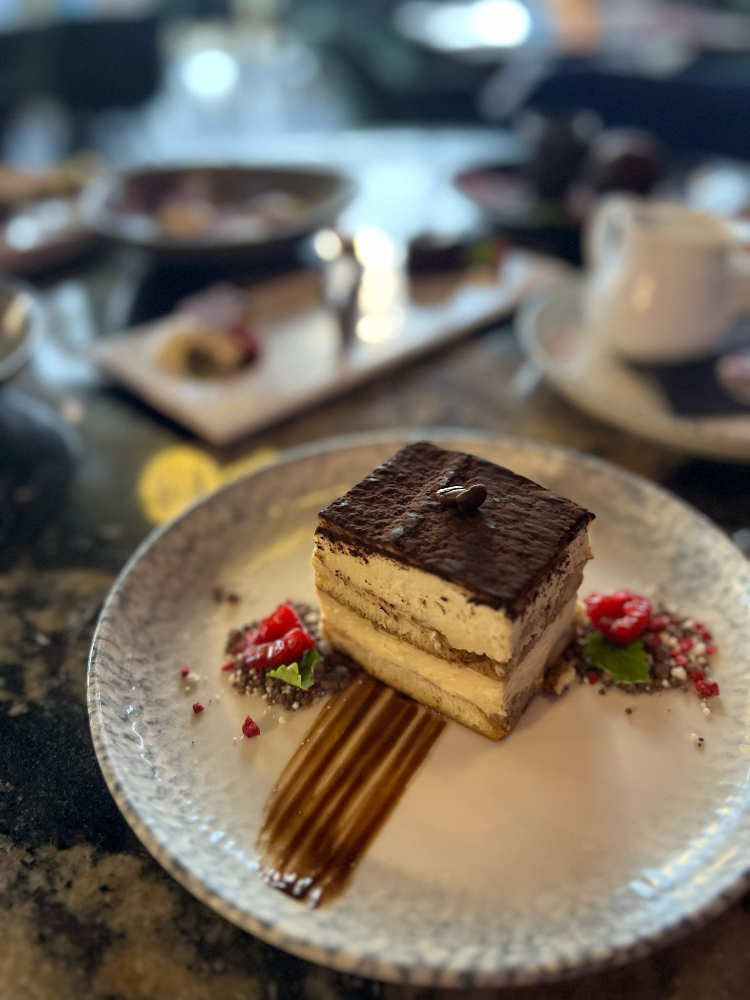 Espresso and Masala soaked lady fingers and mascarpone mousse Finished with a dusting of cocoa
